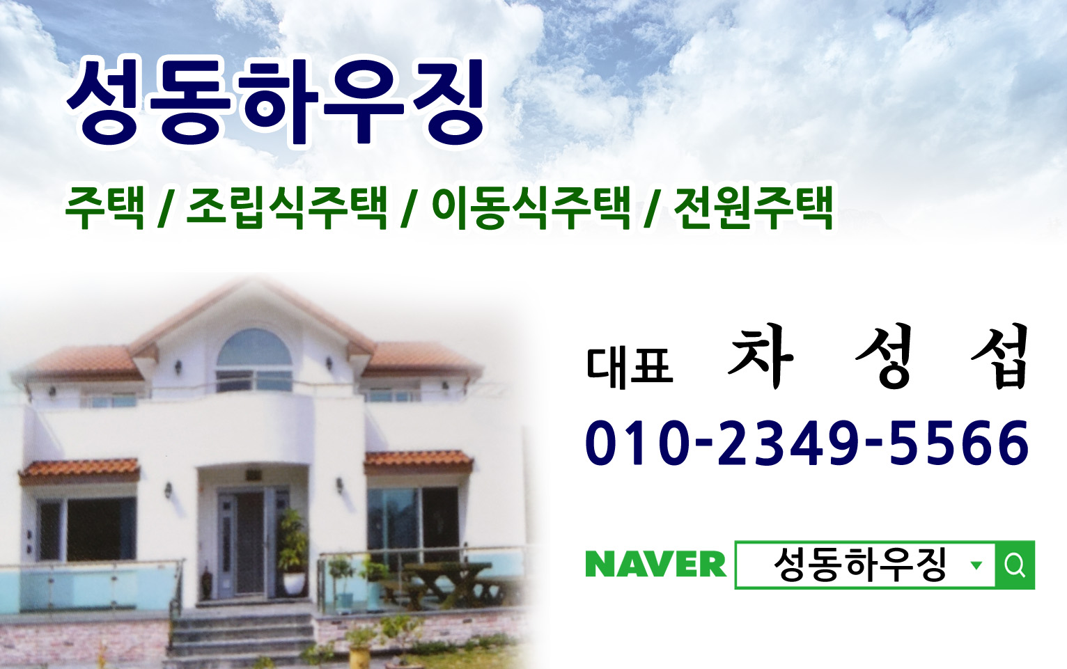 저희 성동하우징은 이동식주택, 조립식주택, 전원주택, 맞춤형주택 등 수년간의 전문경험과 앞서가는 전문 기술력을 바탕으로 항상 성실 책임 시공해드리는 전문업체입니다.