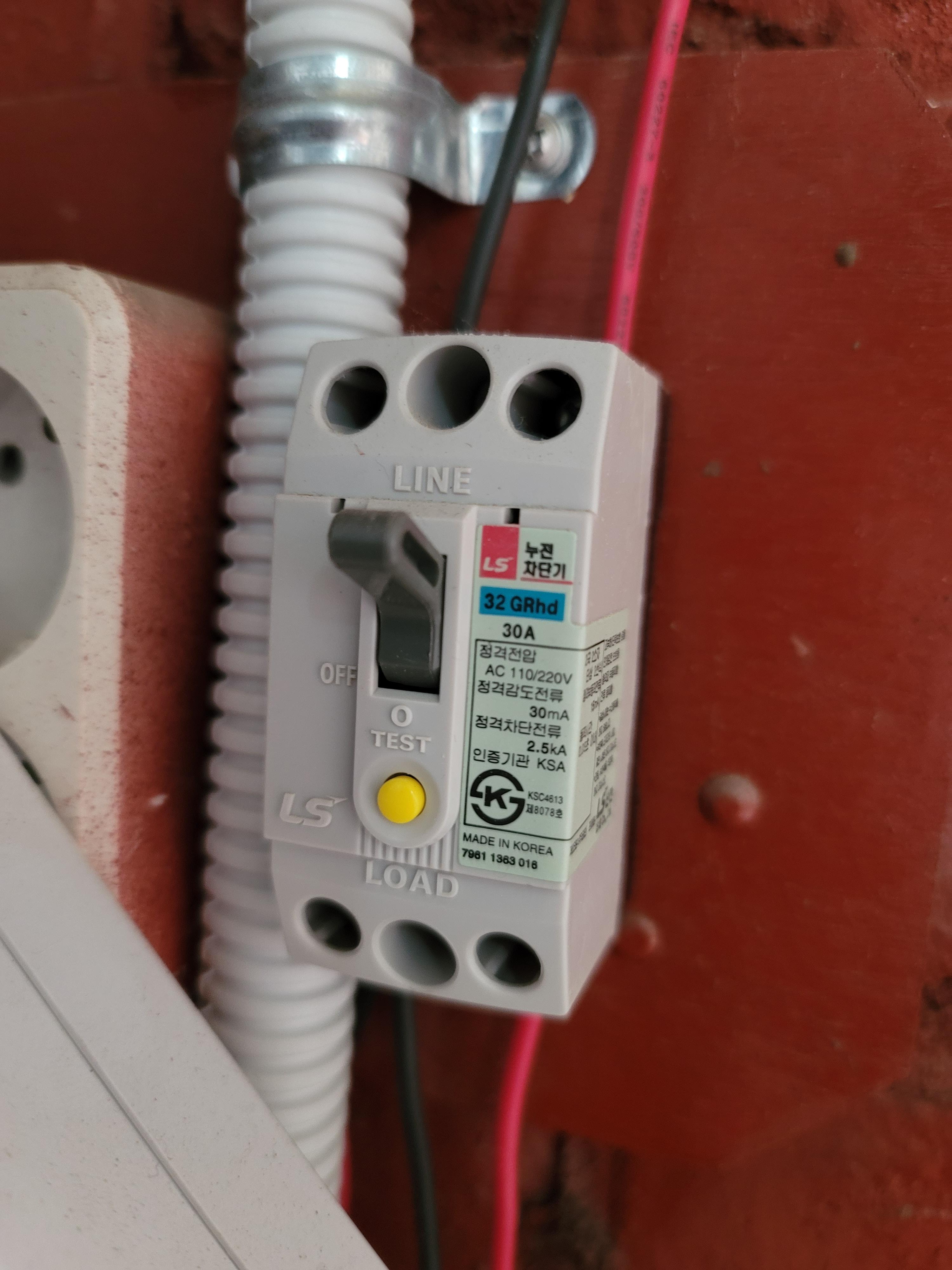 자체 차단기가 달린 구입하여 설치하고 혹시 몰라서 콘센트 앞단에 배선차단기를 하나더 설치한다.
