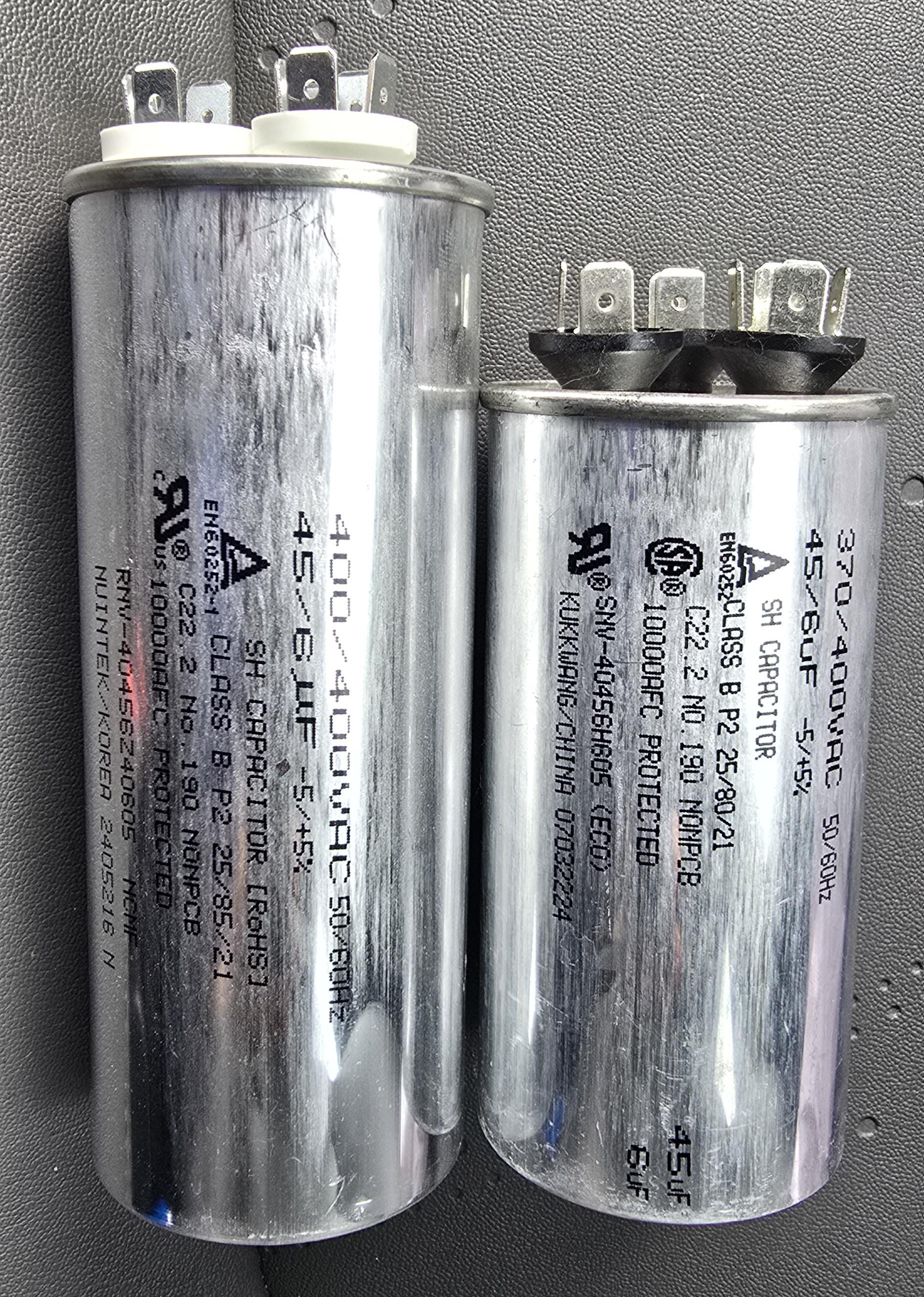 우리집 에어컨 실외기 기동 콘덴서는 370/400V AC 45/6uF 용량이다.