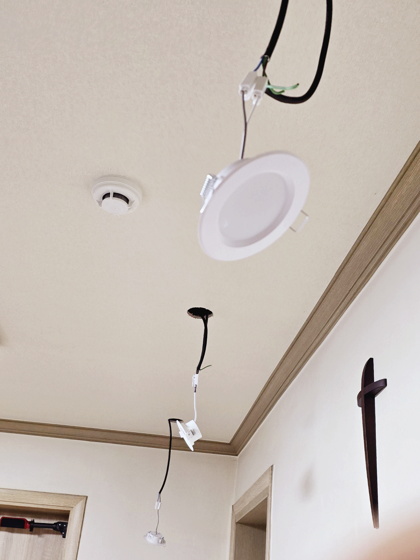 난 20개의 구멍중에 2개 정도가 상에 약간 걸린다. 그런데 석고보드와 몇cm 띄워져 있어서 다운라이트 장착이 된다.